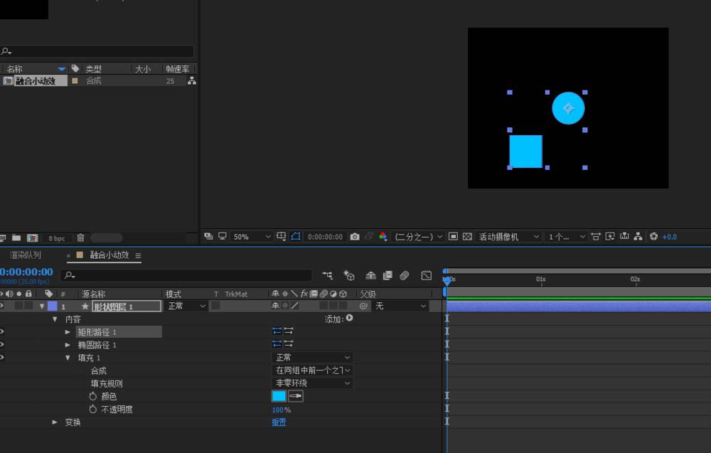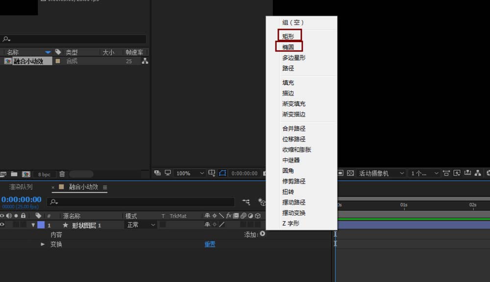 2、在時間線右擊新建一個形狀圖層,添加1個矩形和1個橢圓.添加填充,將矩形和橢圓填充顏色。