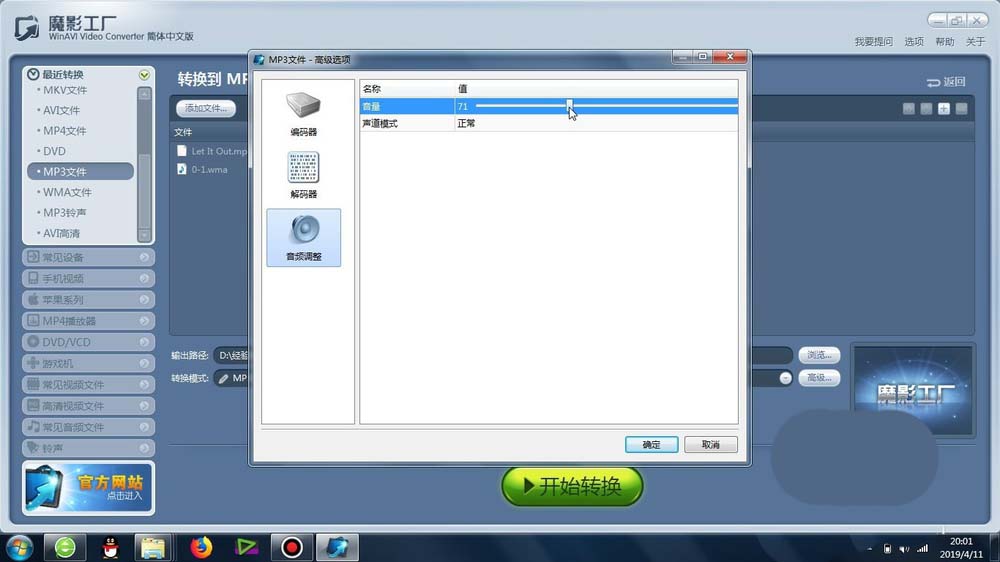5、點(diǎn)擊轉(zhuǎn)換模式后面的高級,可以設(shè)置輸出輸出的各種格式,最主要的就是設(shè)置-音頻調(diào)整,里面的音量可以加大或者減小
