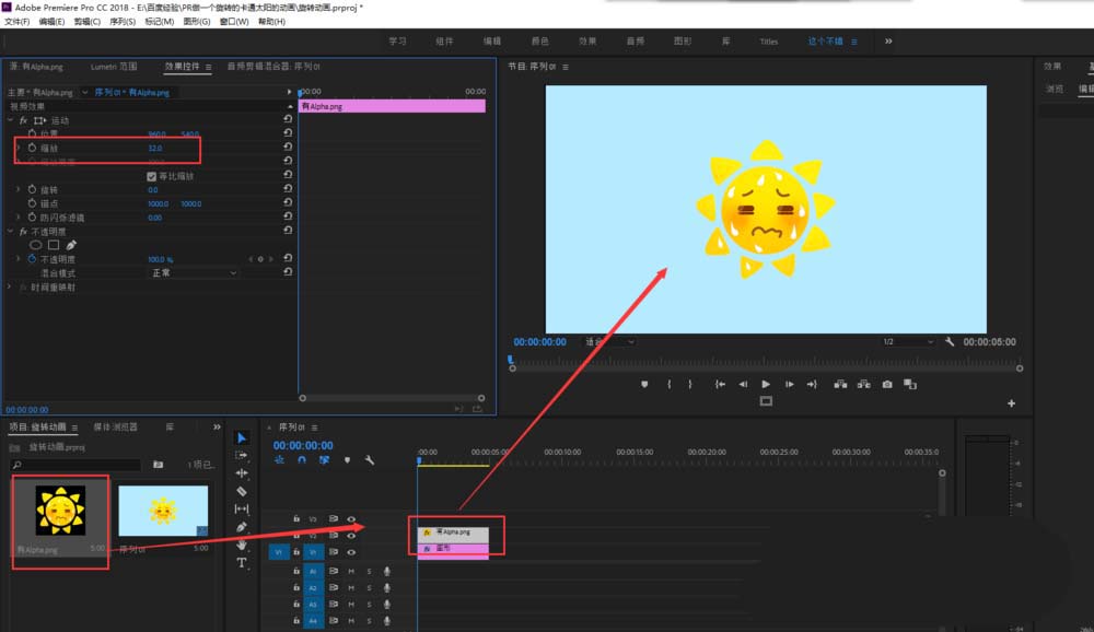 4、選中導(dǎo)入的卡通太陽(yáng)的素材,將它放到序列的視頻軌道2上,并在效果控件的縮放設(shè)置中將圖片素材縮放到合適大小。
