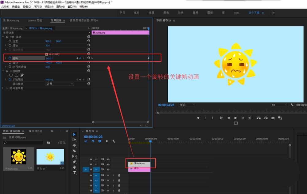 premiere中制作動(dòng)畫(huà)效果很方便,今天我們就來(lái)看看看給卡通小太陽(yáng)添加旋轉(zhuǎn)動(dòng)畫(huà)效果的教程,請(qǐng)看下文詳細(xì)介紹。