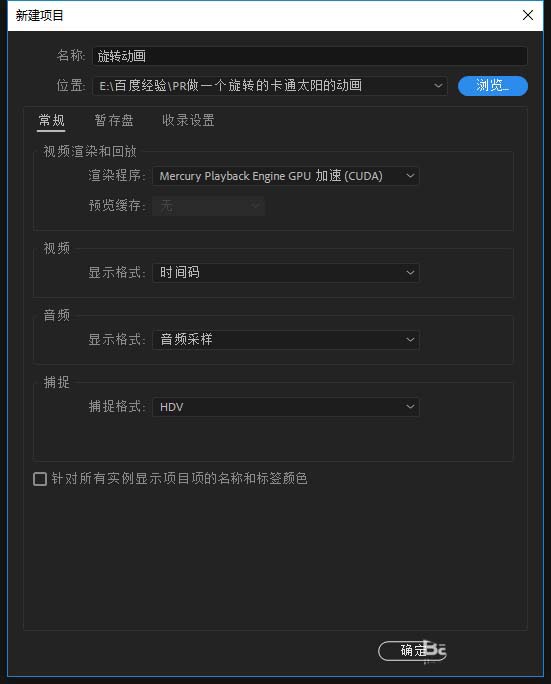 1、啟動(dòng)Premiere軟件之后,先選擇新建一個(gè)PR的項(xiàng)目,在項(xiàng)目設(shè)置窗口中根據(jù)實(shí)際情況來(lái)設(shè)置PR項(xiàng)目參數(shù)。