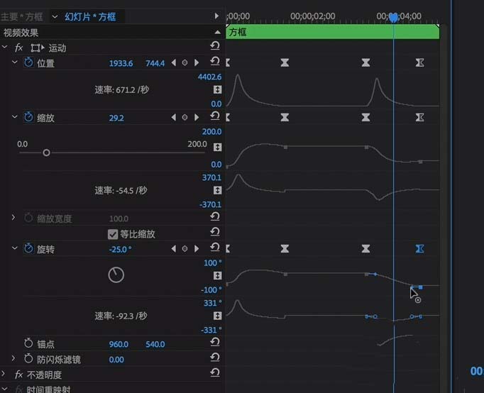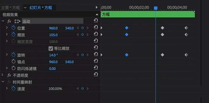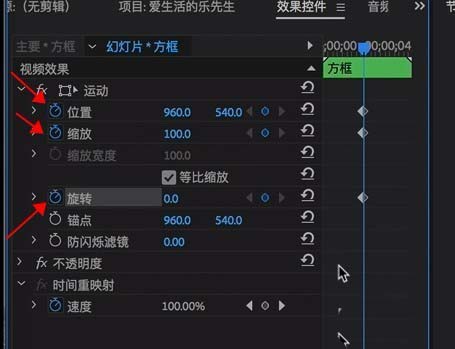 5、切換至幻燈片序列,把新建的序列托至圖片1的上方,開啟 位置 縮放 旋轉 前面的小秒表制作關鍵幀動畫