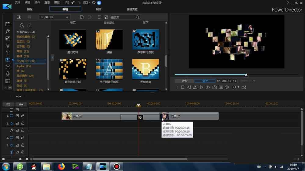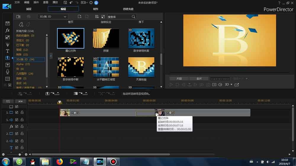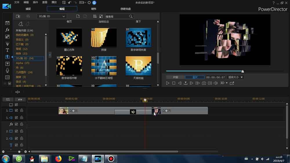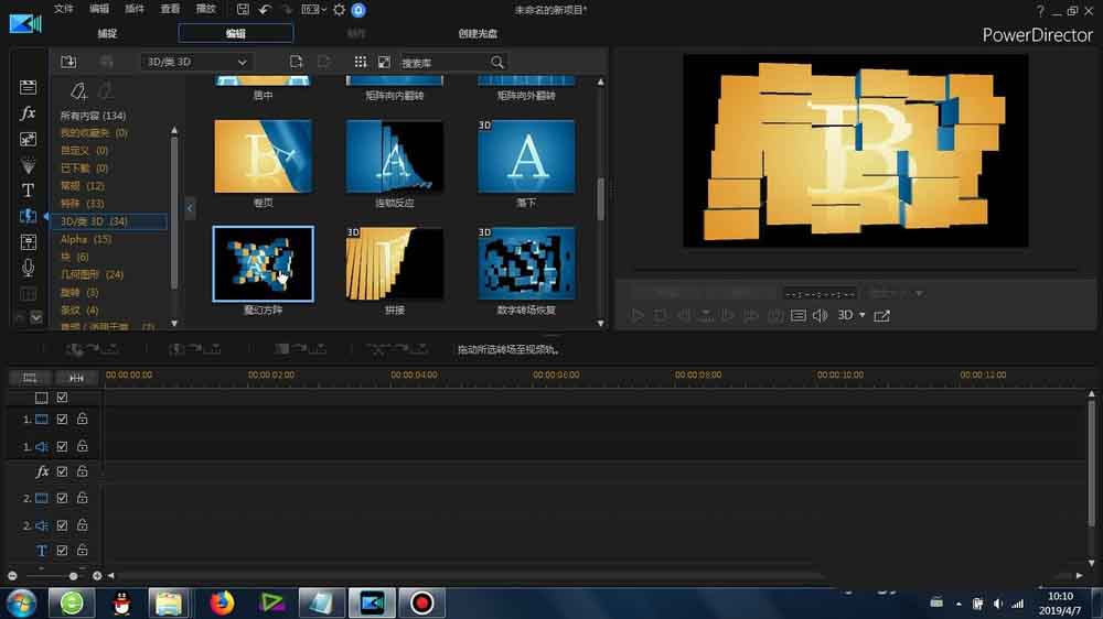 1、這里的“魔幻方陣”轉(zhuǎn)場(chǎng)是在威力導(dǎo)演里面的-轉(zhuǎn)場(chǎng)-3D/類(lèi)3D-里面可以找到