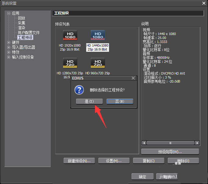 5、系統(tǒng)將彈出一個(gè)提醒窗口,詢問是否刪除當(dāng)前選擇的工程預(yù)設(shè),直接點(diǎn)擊【是】即可