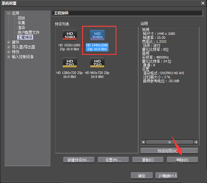 4、這時(shí),我們可以看到窗口右側(cè)列出了系統(tǒng)默認(rèn)的四種工程預(yù)設(shè),我們點(diǎn)擊選中不想要的工程預(yù)設(shè),點(diǎn)擊右下角的【刪除】按鈕