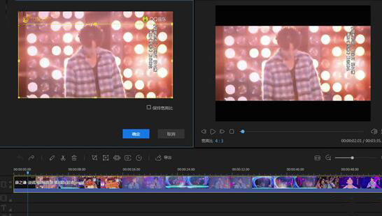 3、在裁剪過程中,用戶可以拖動(dòng)視頻的進(jìn)度觀看剪裁的區(qū)域,你也可以選擇是否“保持寬高比”進(jìn)行調(diào)節(jié),保持寬高比將會(huì)使視頻原本的寬高進(jìn)行鎖定,如果視頻存在水印,其實(shí)只需要把存在水印的那一部分進(jìn)行裁剪,即可完美解決視頻水印的問題,最后點(diǎn)擊“確定”即可完成剪視頻的全部步驟,如下圖所示: