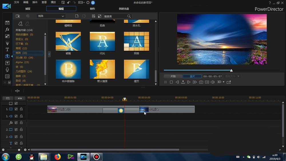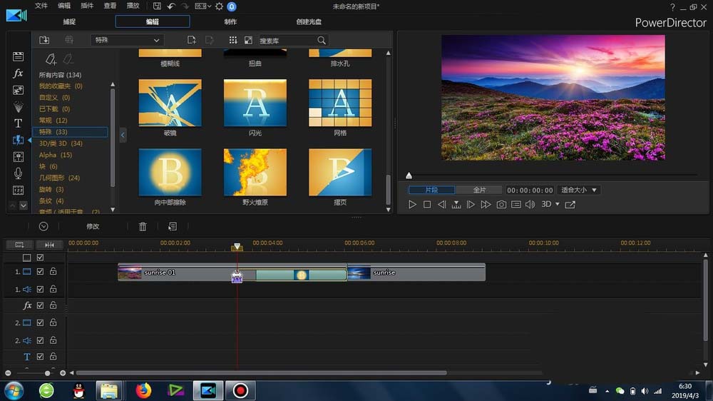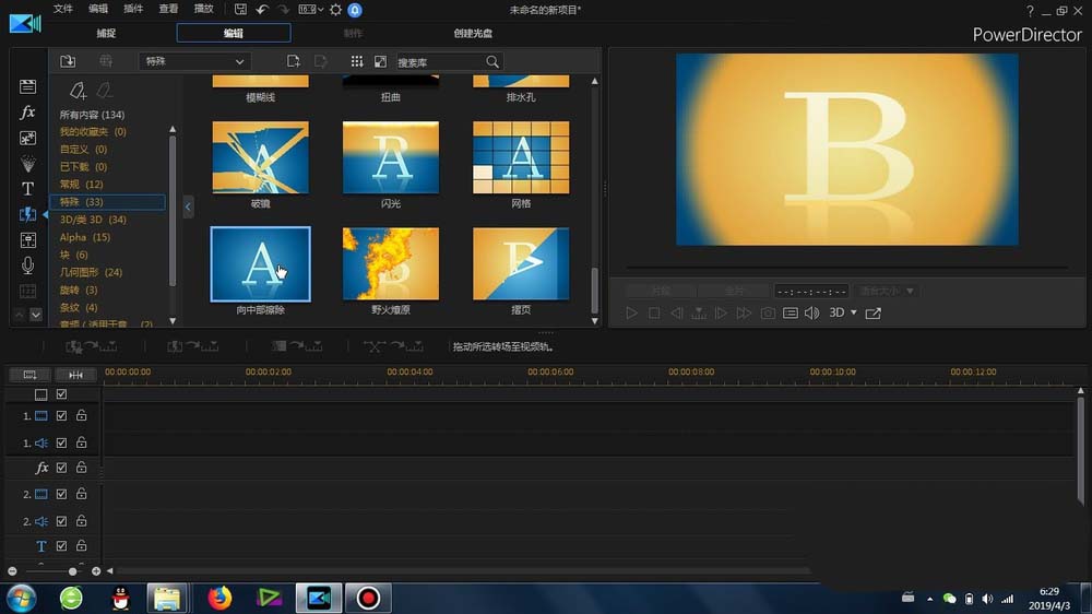 1、這里的“中間擦除”轉場是在威力導演里面的-轉場-特殊-里面可以找到