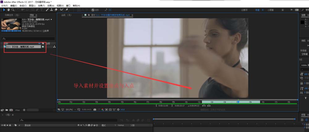 1、在Adobe After Effects軟件中導(dǎo)入動(dòng)態(tài)的視頻素材,雙擊該動(dòng)態(tài)視頻素材進(jìn)行預(yù)覽,選擇我們想要的片段設(shè)置入點(diǎn)與出點(diǎn)。
