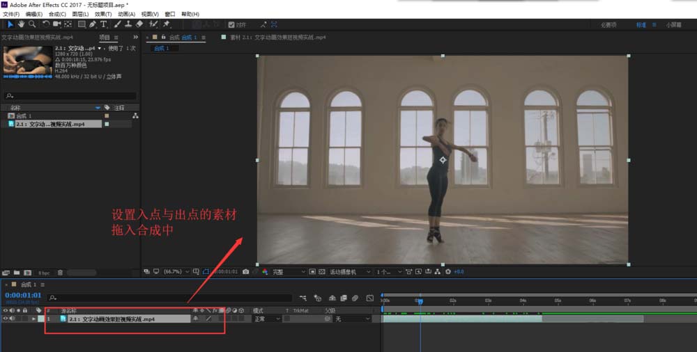 3、創(chuàng)建合成之后,在雙擊動(dòng)態(tài)視頻素材,將設(shè)置了入點(diǎn)與出點(diǎn)的視頻片段拖入新建的合成中。