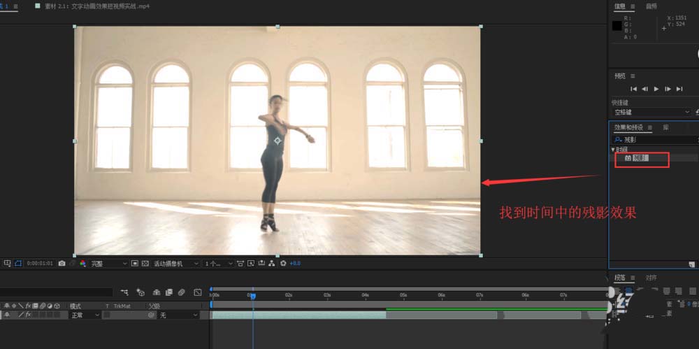 4、在效果與預(yù)設(shè)搜索框中搜索“殘影”,得到時(shí)間中的殘影效果,選擇搜索得到的殘影效果將其施加給視頻素材。