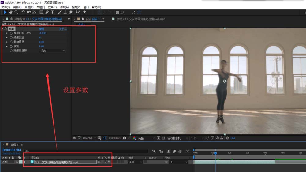 5、打開效果控件,設(shè)置殘影的殘影數(shù)量;起始強(qiáng)度以及殘影的運(yùn)算符。當(dāng)然具體效果的參數(shù)要根據(jù)你自己的視頻來進(jìn)行設(shè)置。
