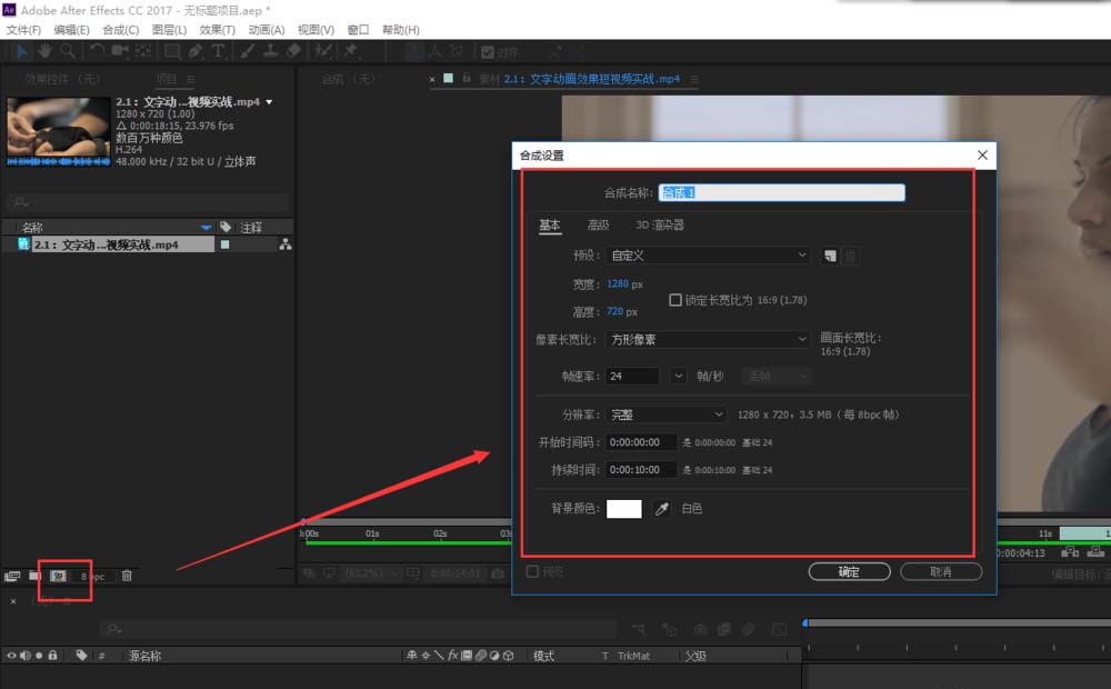2、單擊新建合成按鈕,彈出合成設(shè)置對(duì)話窗口,在合成設(shè)置對(duì)話窗口可以根據(jù)視頻素材的一些屬性來設(shè)置合成參數(shù)。