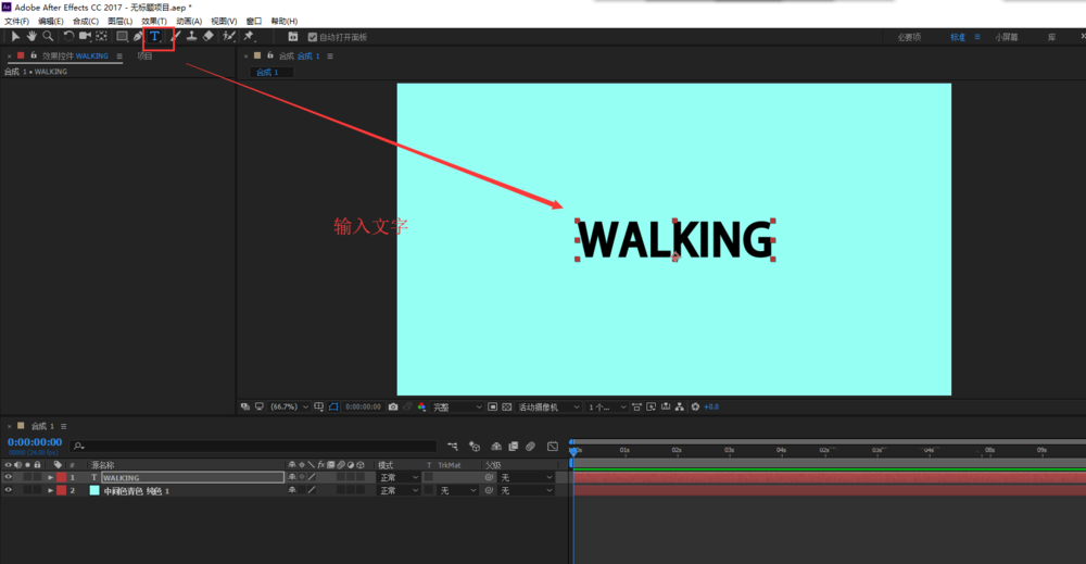 4、選擇文字工具,在合成1預覽窗口單擊并輸入“WALKING”文字內容,然后選中文字設置其屬性與對齊方式讓文字置于中央位置。
