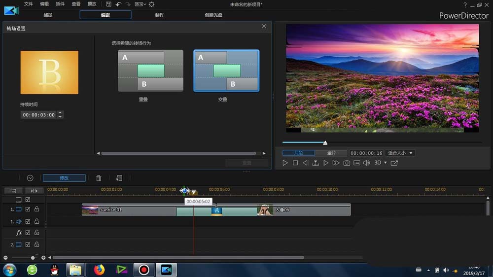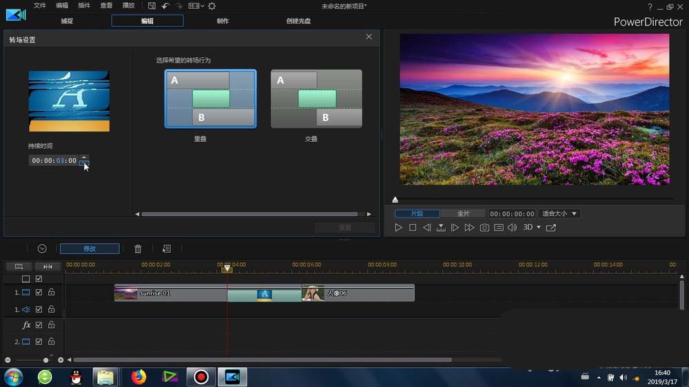 5、雙擊這個轉場標識,可以打開其設置窗口,可以設置它的特效持續時間、轉場的行為以及轉場的方向