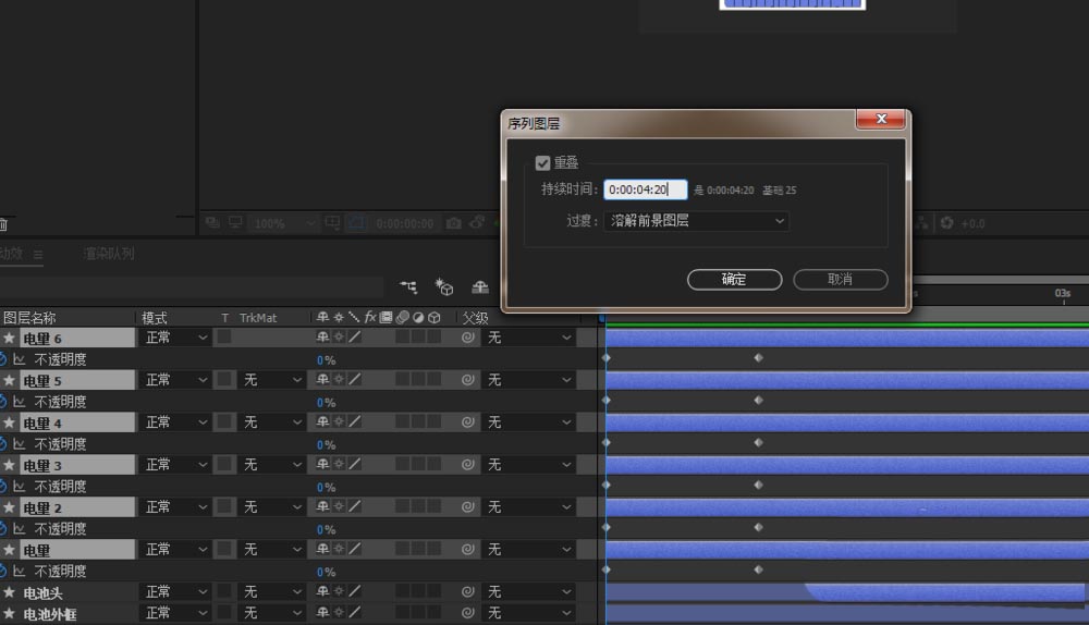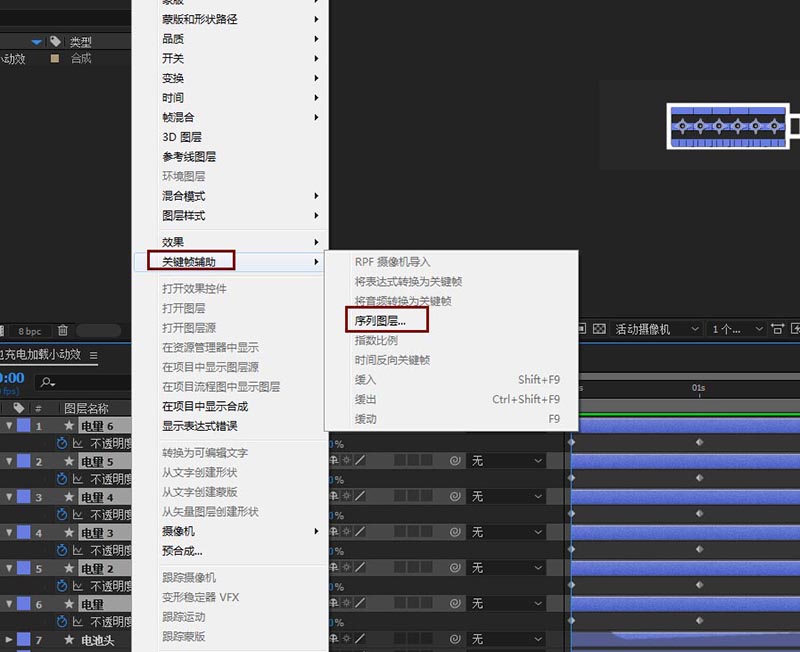 5、我們需要把這些電量在不同時間段的時候顯示,所以選中所有電量,注意選擇的時間要至下而上哦。然后右擊關鍵幀復制選擇系列圖層,設置間隔時間。