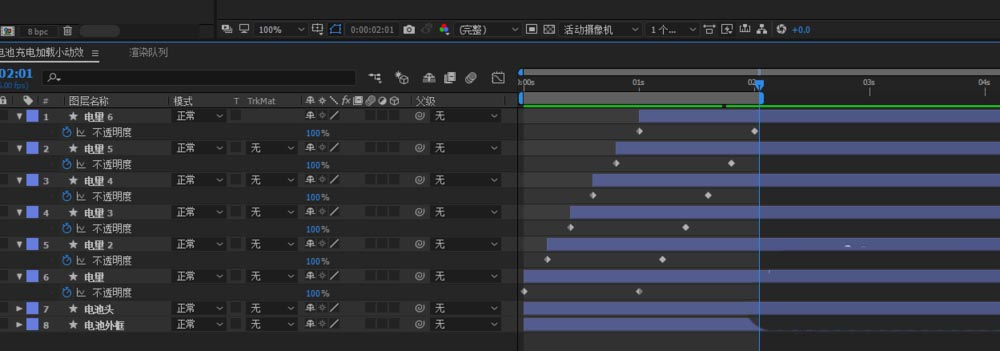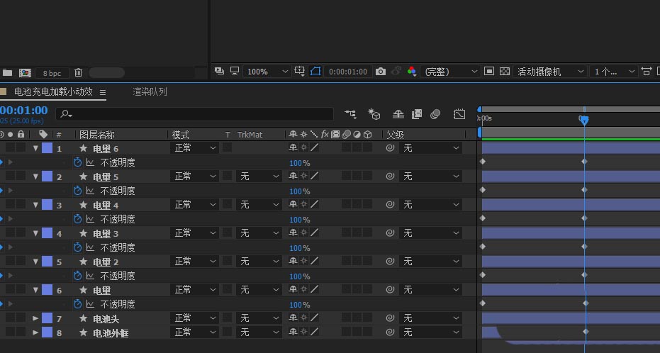 4、選中所有電量圖層,按下T鍵打開不透明度屬性,在第0s出k關鍵幀,起始值為0 ,第二幀1s處設置不透明度為100.