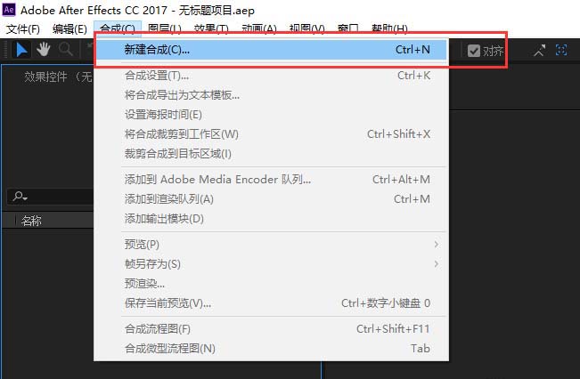 1、雙擊Adobe After Effects軟件的快捷圖標(biāo)啟動(dòng)打開這個(gè)軟件,進(jìn)入到AE軟件編輯界面,在合成中找到新建合成命令。