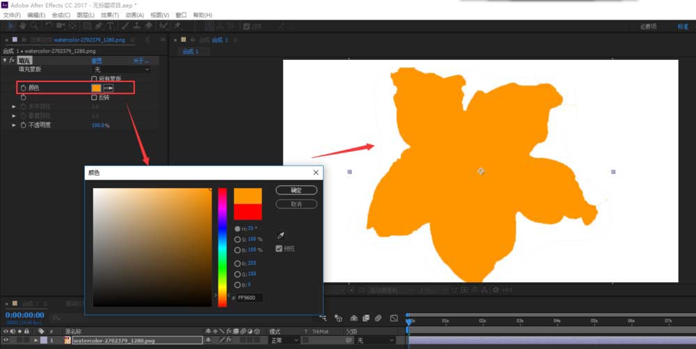 5、添加了填充效果之后,在效果控件中單擊填充的顏色色塊,會(huì)彈出“顏色”對(duì)話框,在顏色對(duì)話框中選擇一個(gè)你喜歡的顏色,這個(gè)顏色就是填充素材的顏色。