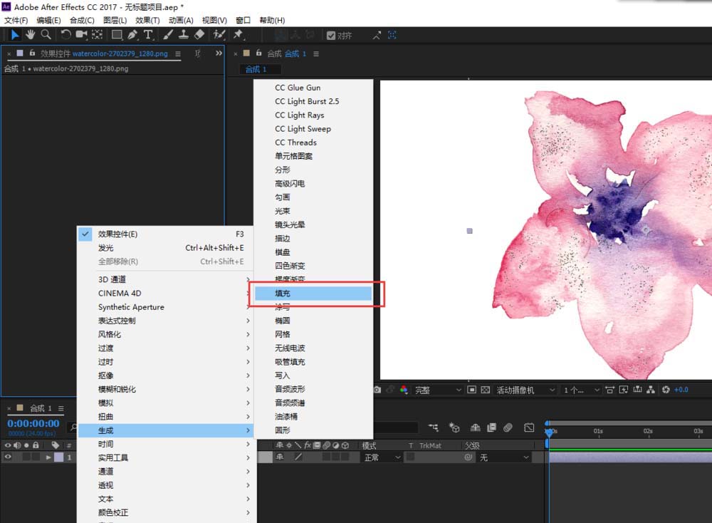 4、選中透明背景圖片素材,找到效果控件窗口,在該窗口右鍵鼠標(biāo)選擇并執(zhí)行生成中的填充效果。
