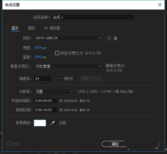 2、彈出合成設(shè)置的窗口,在合成設(shè)置窗口中設(shè)置合成的大小為1920*1080像素,像素長寬比為方形,幀速率為24.然后單擊確定來創(chuàng)建AE合成。