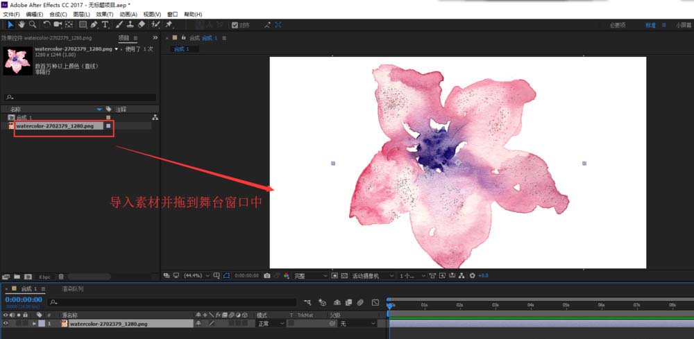 3、在AE項(xiàng)目窗口空白處雙擊鼠標(biāo)導(dǎo)入一個(gè)透明背景色圖片素材,即.jpg 格式的圖片,并將該圖片拖入舞臺(tái)窗口中。
