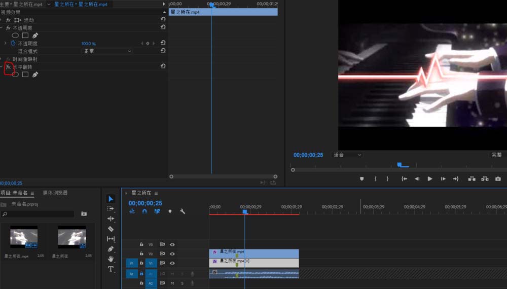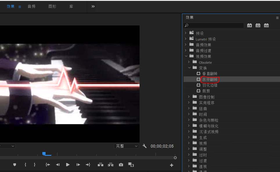 3、找到效果——視頻效果——變換——水平翻轉,按住拖到視頻上