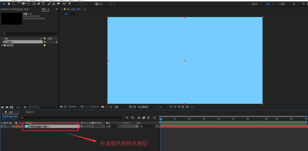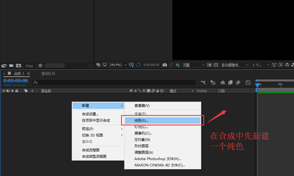 2、在AE合成的圖層管理窗口空白處,右鍵鼠標(biāo),然后彈出右鍵鼠標(biāo)選項(xiàng),在右鍵選項(xiàng)中選擇新建中的純色(比較低的AE版本叫固態(tài)層)。