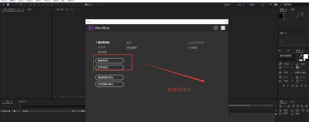 1、啟動(dòng)AE軟件之后,在開(kāi)始頁(yè)面中選擇單擊新建項(xiàng)目,有的人打開(kāi)AE之后可能沒(méi)有開(kāi)始界面,那么直接在文件菜單中新建項(xiàng)目即可。