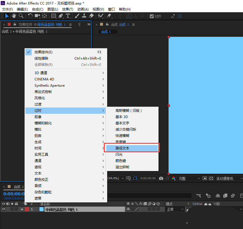 4、找到效果控件窗口,在效果控件窗口右鍵鼠標(biāo),找到過(guò)時(shí)效果中的路徑文本這個(gè)效果,單擊添加路徑文本這個(gè)效果。