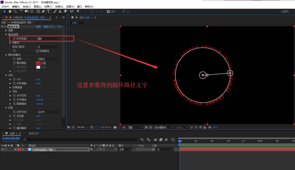 6、在路徑文本效果中選擇形狀類型為圓形,其他參數(shù)大家也可以根據(jù)需要進(jìn)行選擇調(diào)整,在調(diào)整圓形的控制柄達(dá)到最終圓形路徑排版文字效果。