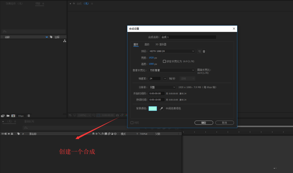 1、單擊合成按鈕,打開合成設置窗口,設置調整好合成的參數,點擊確定創建一個合成。