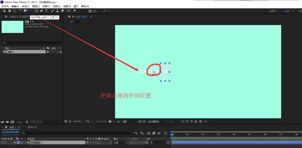 4、選中形狀圖層,選擇錨點工具,將繪制的箭頭的錨點移動到中間位置;或者快捷方法按住Ctrl鍵雙擊錨點工具可達到相同目的。
