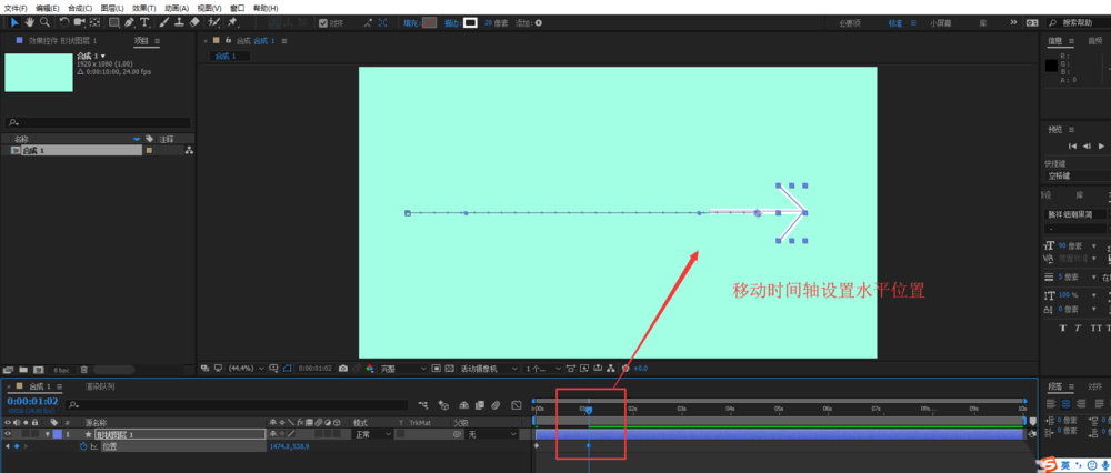 6、往后移動幾幀,在調整位置的水平方向上的數值,是的箭頭從左邊運動到右邊。播放時間軸,一個運動箭頭動畫就完成了。