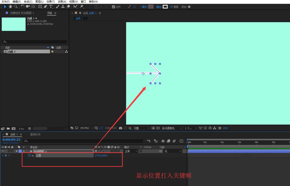 5、在形狀圖層按P鍵可以展開位置效果,將時間線移到最左邊位置,然后在位置上打入一個關鍵幀。