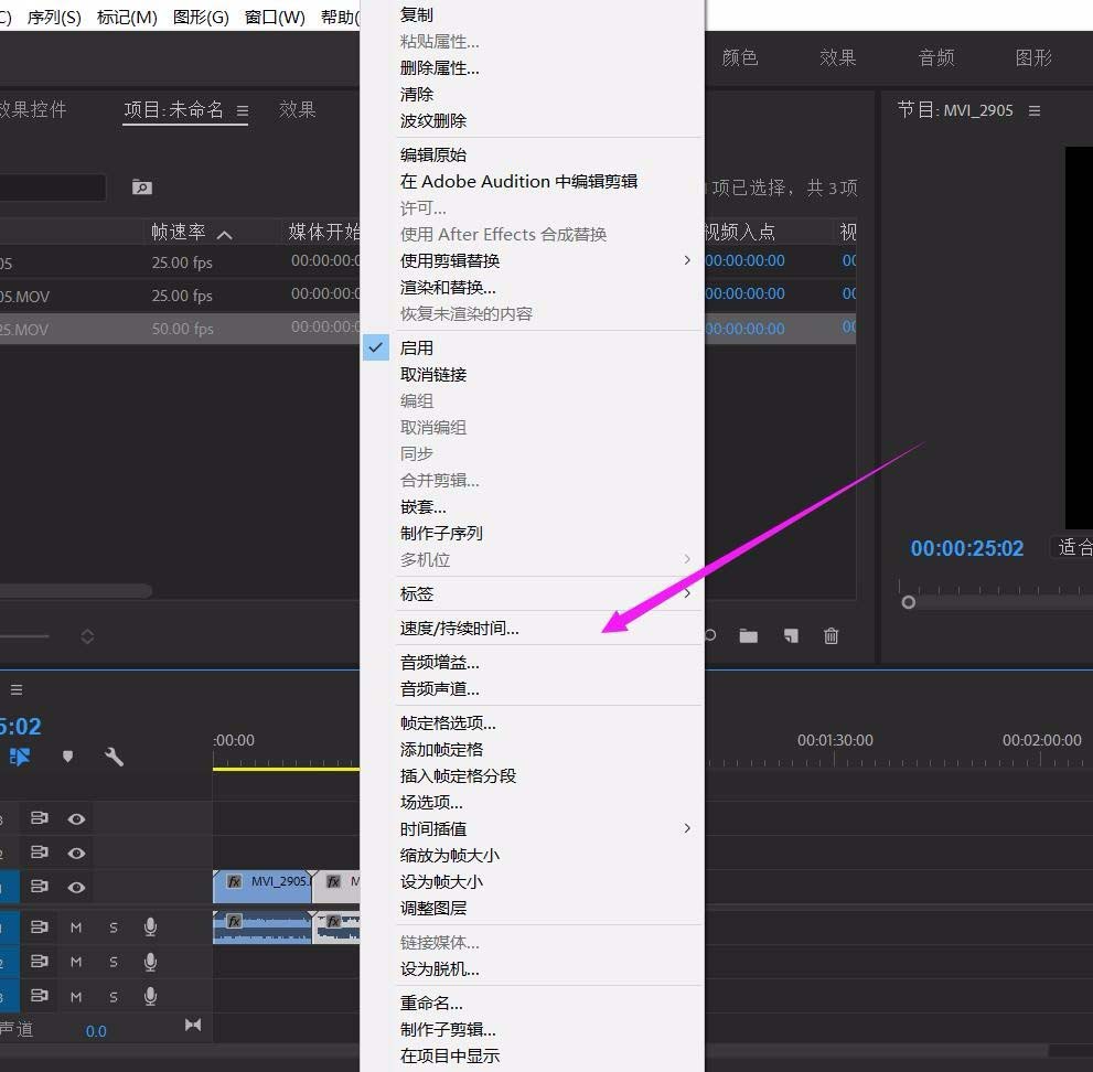 2、在右鍵的面板中選擇“速度/持續(xù)時(shí)間”按鈕。