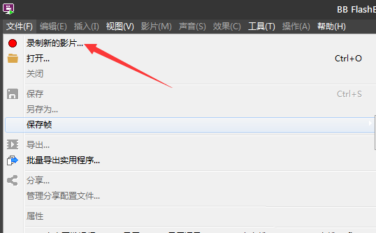 1、首先,打開一個的BB FlashBack的進入到了的界面當中。點擊了的菜單中的 文件 菜單,彈出了下拉菜單選中為 錄制新的影片 的選項。
