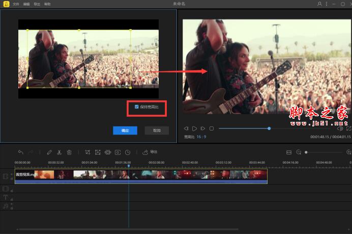 5、在裁剪窗口中勾選“保持寬高比一致”,防止裁剪后還是出現黑邊。然后縮小黃色的邊框至預覽窗口中不再出現黑邊。