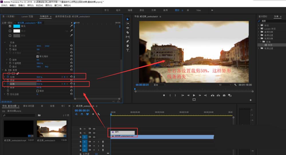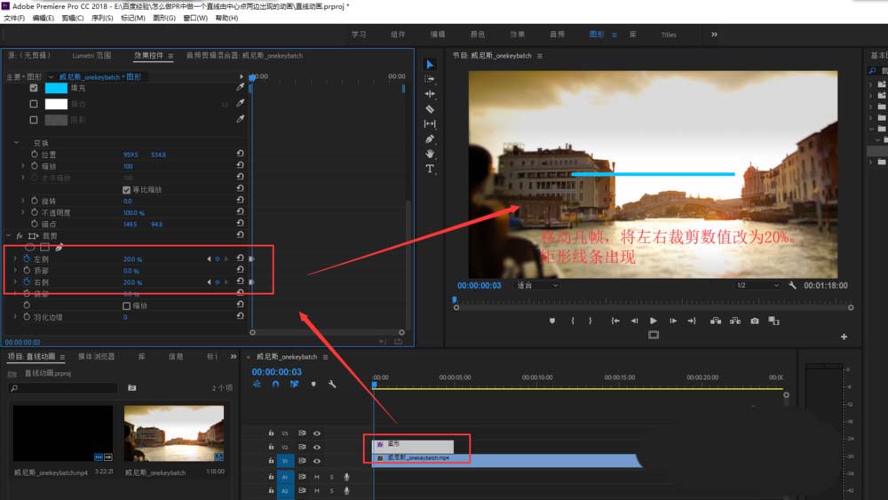 6、選中圖層,打開效果控件,找到裁剪效果,在裁剪的左側(cè)與右側(cè)各打入一個關(guān)鍵幀,并設(shè)置數(shù)值都為50%,這樣線條就消失了;然后在隔幾幀,在設(shè)置左側(cè)與右側(cè)的數(shù)值為20%。播放視頻,一個線條由中心兩邊出現(xiàn)的動畫就出現(xiàn)了。