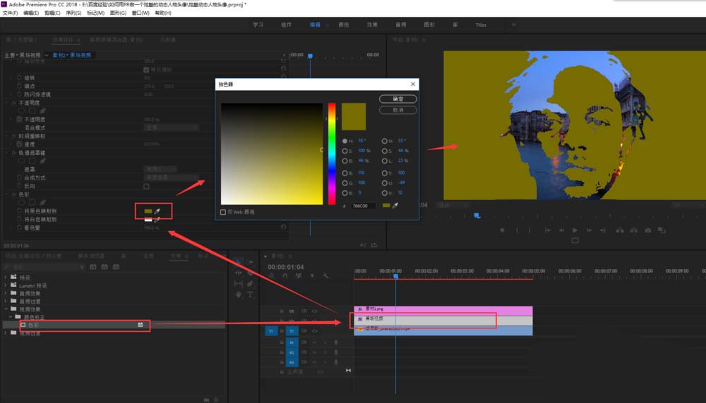 6、施加色彩效果黑場視頻上,并在效果控件的色彩的將黑色映射到命令更改一個顏色。在選中人物頭像素材,在效果控件中調整閾值的級別,到合適為止。播放預覽視頻效果,一個炫酷的動態人物頭像就完成了。