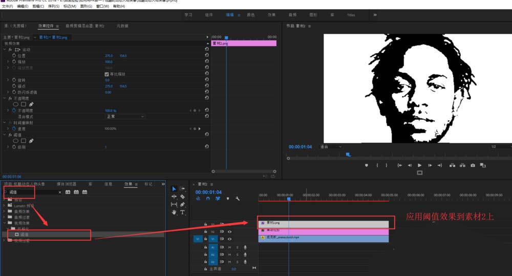 4、找到效果窗口,在效果窗口的搜索框中輸入“閾值”并回車進行搜索,將搜索得到的閾值效果拖拽應用到視頻軌道3的人物頭像上,這樣人物頭像就變成黑白的了。