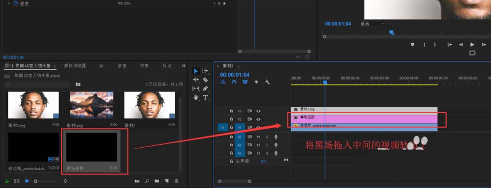 2、將人物頭像與視頻素材都拖入到時間軸的視頻軌道上,當然前提要先新建一個序列,將人物頭像照片放在視頻軌道3上,將視頻素材放在視頻軌道1上。