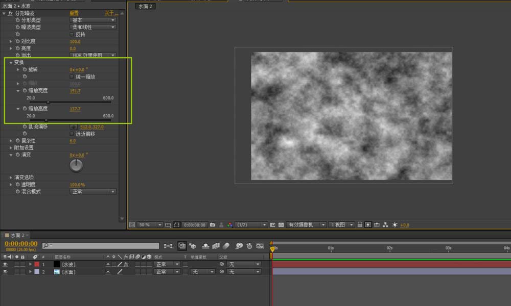 3、打開分形噪波的變換屬性,點掉統一縮放,這樣就可以單獨調整固定層的長寬數值了,根據自己的感覺去調整對應的長寬。