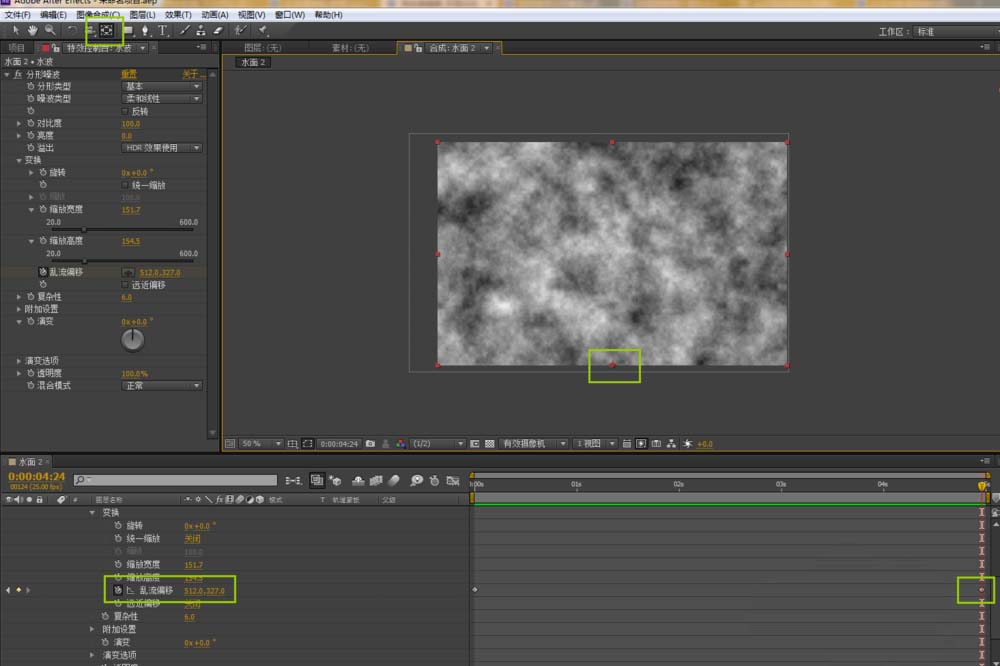 4、然后給亂流偏移在開始0s處K個關鍵幀,在最后一幀K個關鍵幀,同時將固定層的中心點利用錨點工具移至下方中點處