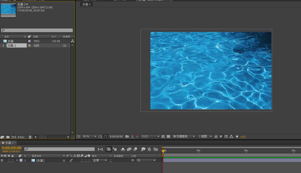 1、打開AE,拉入一張水面的圖片,鼠標左鍵按住圖片拖到新建合成,將這張圖片新建個合成,并命名為水面