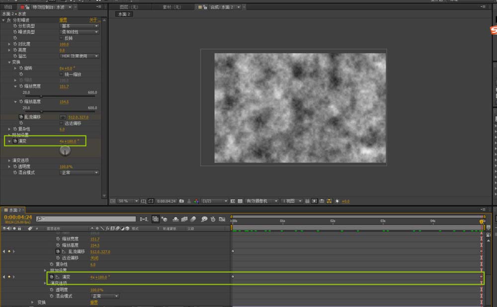 5、同樣給演變在開始0s處K個關鍵幀,在最后一幀K個關鍵幀,并且屬性值調整到合適的大小,這邊的其他屬性,比如分形類型,噪波類型,復雜性等,都可以去調節一下,這樣效果更逼真一些,我這邊就不再演示了,大家去嘗試一下就知道了哈。
