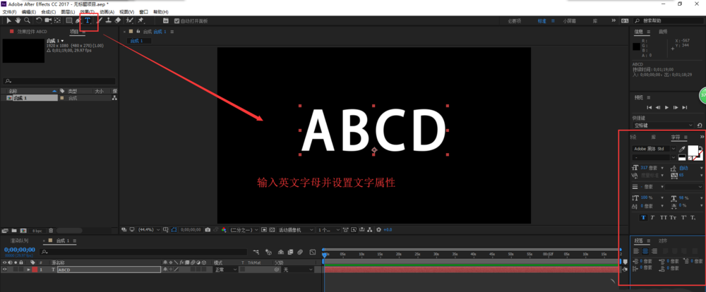 1、打開或新建一個AE空白合成,然后選擇文本工具,在合成中輸入大寫英文字母“ABCD”,然后用選擇工具選中大寫英文字母,在字符窗口中調成文字的大小,字號等,然后在對齊中設置文字中心點對齊。