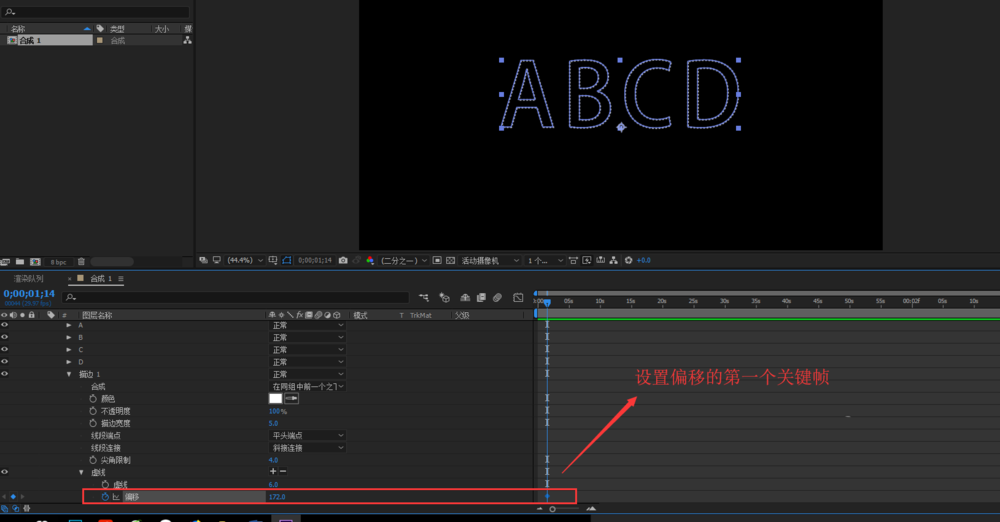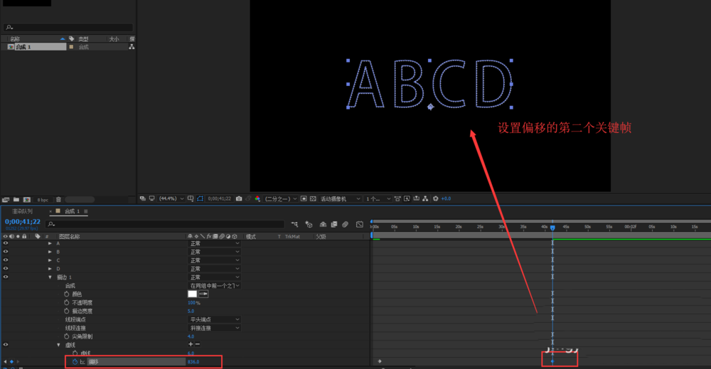 6、在虛線的偏移效果上點擊秒表按鈕打入第一個關鍵幀,并隨意設置一個偏移數值;然后隔一段時間間隔,在打入第二個偏移關鍵幀,并隨意設置偏移的數值。至此效果設置完成,播放就能看到流動的虛線組成的英文字母了。