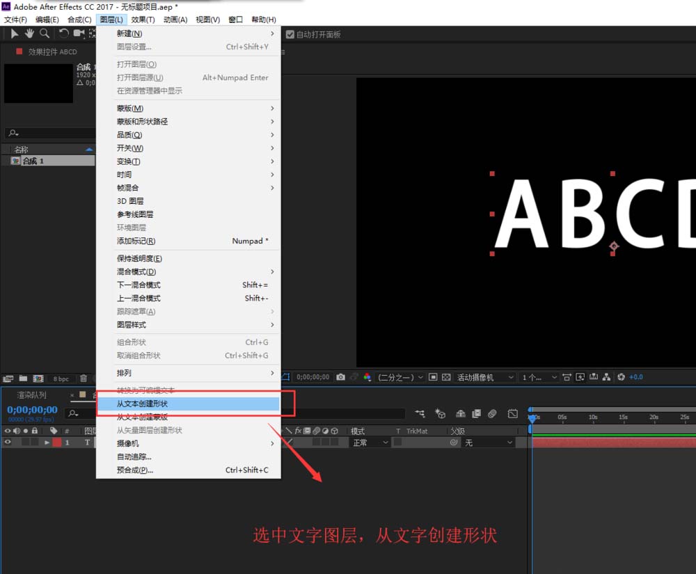 2、選中合成中的文字圖層,打開圖層菜單欄,在圖層菜單欄中會看到一個從文本創建形狀的命令,單擊該命令應用,或者大家右鍵鼠標也可以找到這個命令。