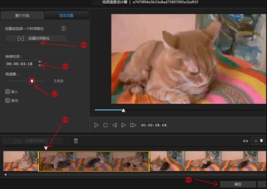 將進度條中的指針移動到需要加速處理的視頻片段的開始位置,點擊“創建時間位移”,在“持續時間”中輸入時長,設置片段的播放速度,拖動滑塊至合適的位置,可以一邊設置一邊觀看效果,然后點擊確定,