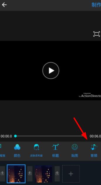 進(jìn)入手機(jī)相冊(cè),選擇視頻素材,然后轉(zhuǎn)入視頻編輯頁(yè)面,點(diǎn)擊“音頻”,